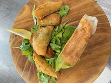 Panzerotto salsiccia e cima di rape uit Puglia, Siciliaanse Panella (kikkererwtje kroketje (VG), Scampi kroketje, Kroketje munt en mozzarella uit Puglia, tomatenmayonaise.