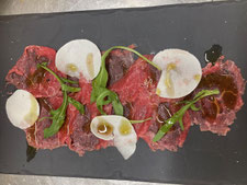 Carpaccio van kalfs roti, tonijnsausv/h huis, kappertjes uit Sicilië,