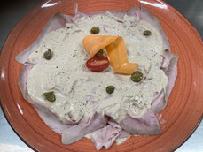 Carpaccio of veal roti, homemade tuna sauce , capers from Sicily, served cold