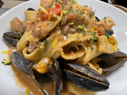 House twisted large tagliatelle pasta, swordfish, mussels, cherry tomatoes, Borlotti beans sauce, lemon zest, little spicy.