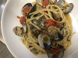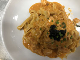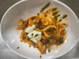 Huisgedraaid brde tagliatelle, zwaardvisfilet, mosselen, tomaatjes, Borlotti bonencreme, citroenzest, licht pikant.