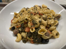 Kleine buizen pasta, met Guanciale spek, tomaat, ui,