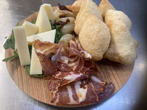 Om te delen plankje, , Salame Napoletano (licht gerookt charcuterievlees uit Napoli), Provolone kaas, olijven, gedroogde tomaten, huisgemaakte warme Gnocchi Fritti op Bologna wijze.