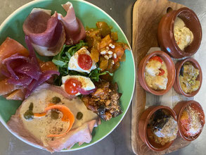 Om te delen plankje, geroosterde paprikas, gegrilde courgetten, aubergines, ontpitte olijven uit Taggia (Ligurie), gedroogde tomaten, ajuintjes uit Puglia, Pecorino uit Sardinie, huisgemaakte warme Gnocchi Fritti op Bologna wijze.