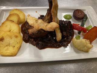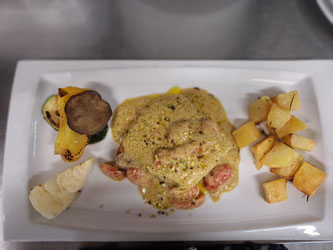 Veal, Gorgonzola sauce, Pleus mushrooms, spring oignon, baked potatoes , hot vegetables.